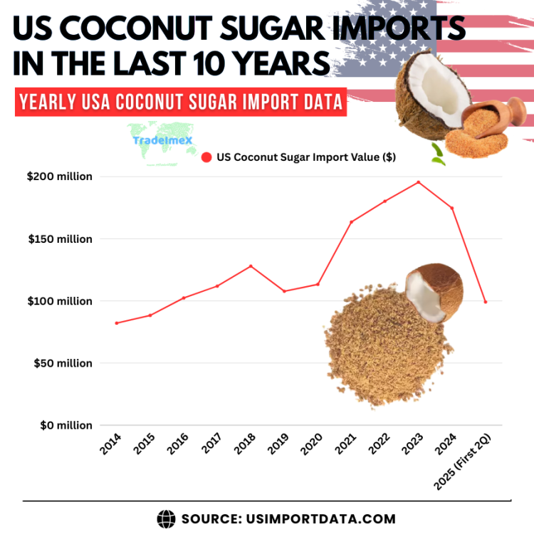 Coconut sugar is a small but fast-growing category in the U.S. sweetener market. Known for its low glycemic index and clean-label appeal, it has shifted from being a niche ingredient for natural food stores to a mainstream option for retail brands, food manufacturers, and health-conscious consumers. According to the US import data and coconut sugar import data of the USA, the total value of US coconut sugar imports reached $174.67 million in 2024, a decline of 11% from the previous year. The US is the 2nd largest coconut sugar importer in the world, as per the global trade data.