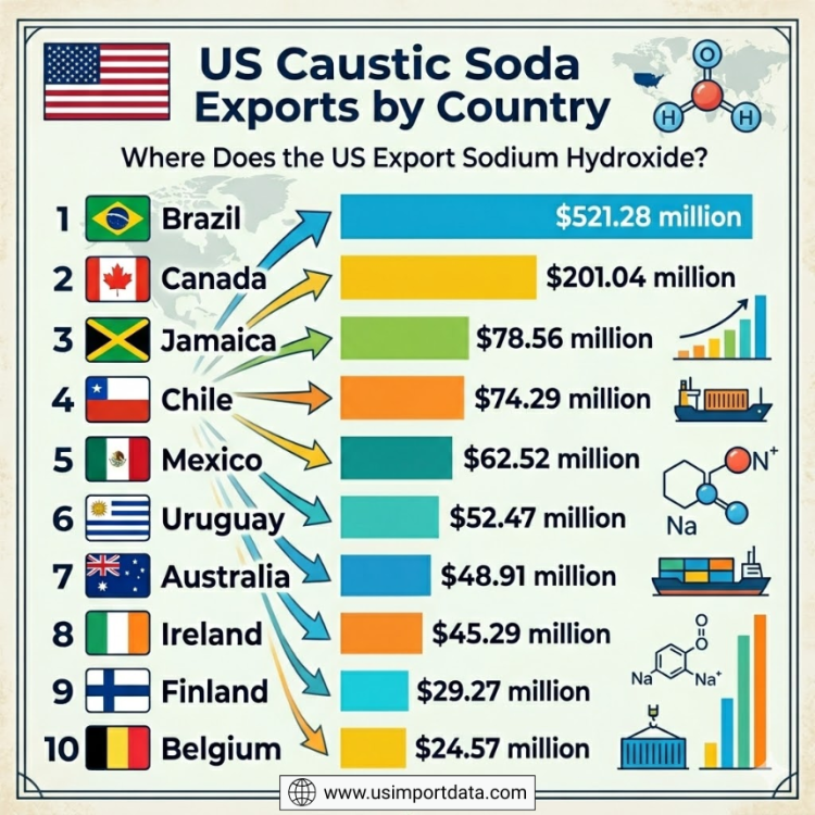 Caustic soda, also known as sodium hydroxide, is a key chemical used in various industries such as paper, textiles, and petroleum. The United States is one of the largest producers of caustic soda in the world, and it also exports a significant amount of this chemical to various countries around the globe. The United States is a significant player in the global caustic soda market, exporting sodium hydroxide to various countries worldwide. With precise data on US caustic soda exports by country, it is evident that the US distributes sodium hydroxide to key trading partners such as Canada, Mexico, Brazil, and various European and Asian countries. The top 10 export destinations for American sodium hydroxide, as per the US shipment data for 2025, include: