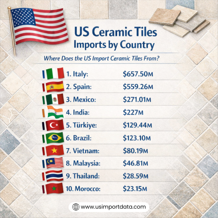 Ceramic tiles are a popular choice for both residential and commercial spaces in the United States. With a wide variety of designs, colors, and sizes available, ceramic tiles offer versatility and durability. The top 10 supplier countries of ceramic tiles to the USA, as per the US ceramic tiles imports by country and US import shipment data for 2025, include: