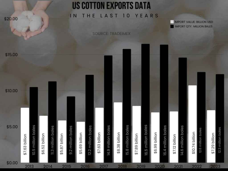Export decline: Since 2020, when the United States shipped 16.4 million bales of cotton, the country's exports have been falling.