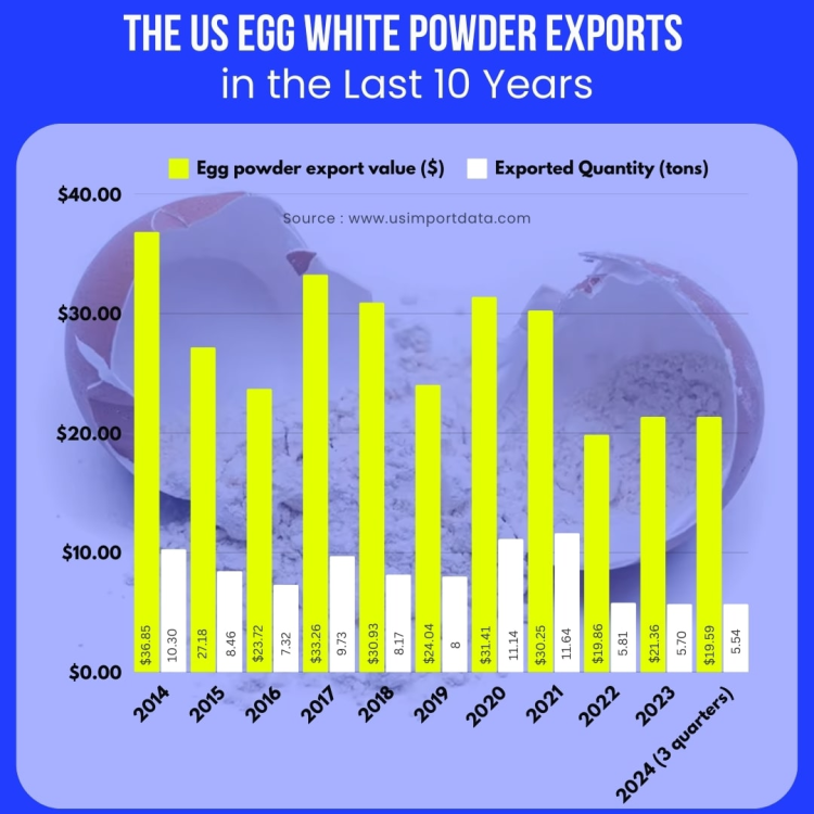 In recent years, the demand for egg white powder has been on the rise due to its numerous health benefits and versatile uses in the food industry. The United States is one of the top producers & exporters of egg white powder, with several suppliers and manufacturers catering to the growing demand both domestically and internationally. According to the latest US export data and egg white powder export data, US egg white powder exports accounted for $21.36 million in 2023-24 with an increase of 8% from the previous year. US egg white powder shipments' total export quantity was 5.70 thousand tons in 2023. As per the US export trade data and US shipment data, US egg white exports reached $19.59 million in the first three quarters of 2024 with a total export quantity of 5.54 million kilograms. The 6-digit HS Code for egg white powder is 040891 .