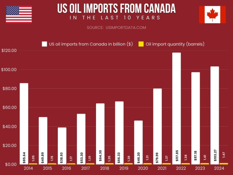 According to the US import data and US-Canada trade data, the US oil imports from Canada accounted for $97.18 billion in 2023 amounting to a total quantity of 223.85 million cubic meters. As per the US shipment data and US oil import data, the US oil imports from Canada reached $103.27 billion in 2024, an increase of 12% from the previous year.